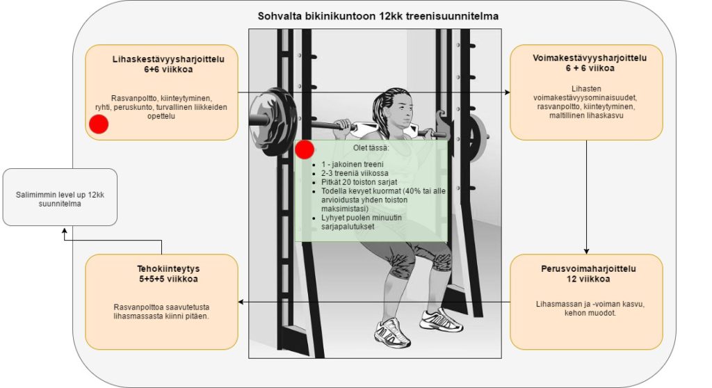 Tervetuloa suorittamaan Sohvalta bikinikuntoon treenisuunnitelmaa! Suunnitelma on vuoden mittainen ja se sisältää yhteensä 140 salitreenipäivää. Sulje hetkeksi silmäsi ja mieti, mitä 140 treeniä sinussa saa aikaan.. Mitä se tarkoittaa henkilökohtaiselle fysiikallesi, tai henkiselle hyvinvoinnillesi ja itsetunnollesi?